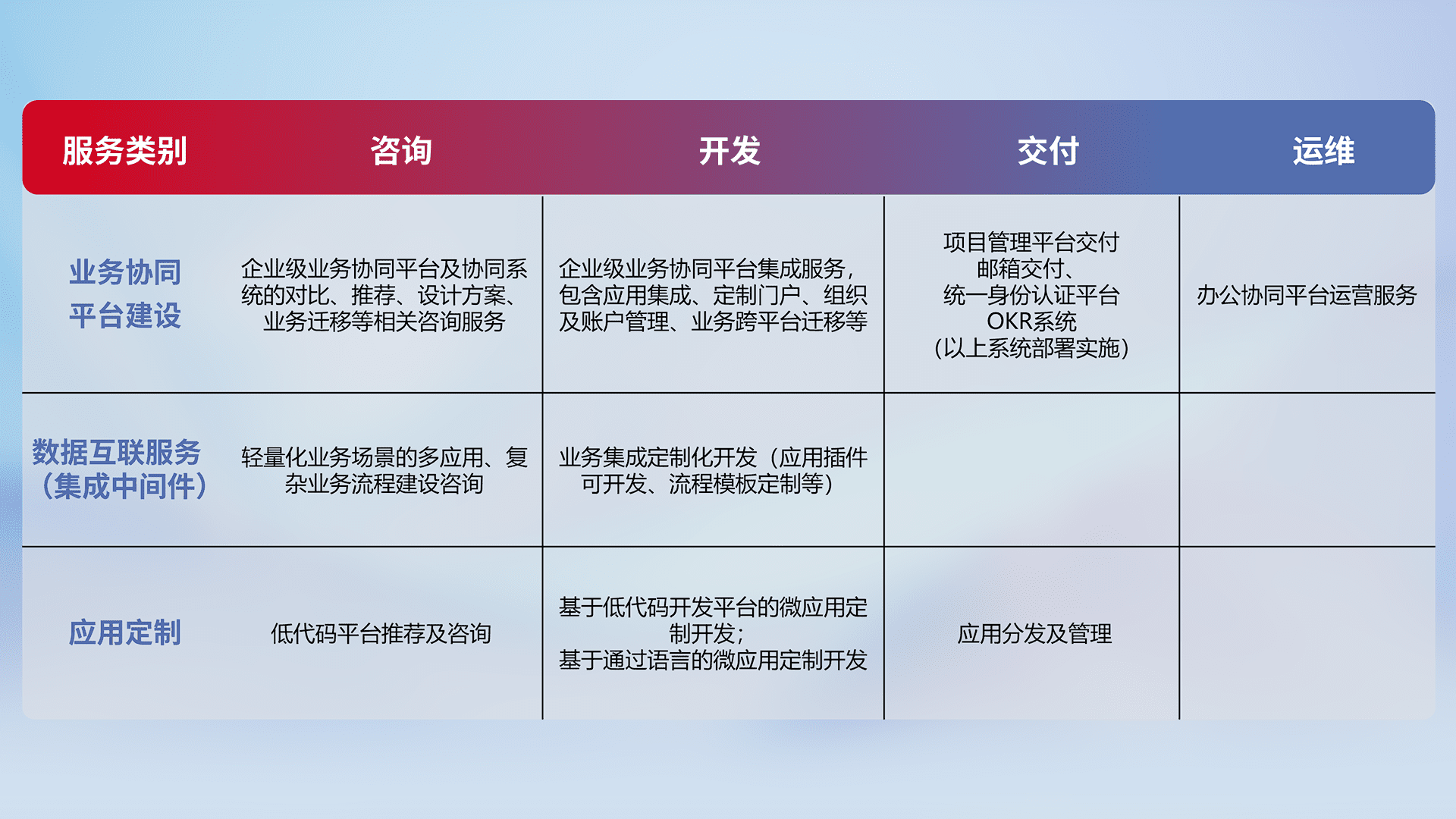 针对钉钉、、、企微、、、IDaas等平台级产品提供产品的规划、、、方案、、交付、、、定制化开发等服务,,实现如统一协同办公、、、智能客户服务、、、混合会议管理、、、、智能数据查询、、、等业务场景,,,,实现数字化转型。。。。