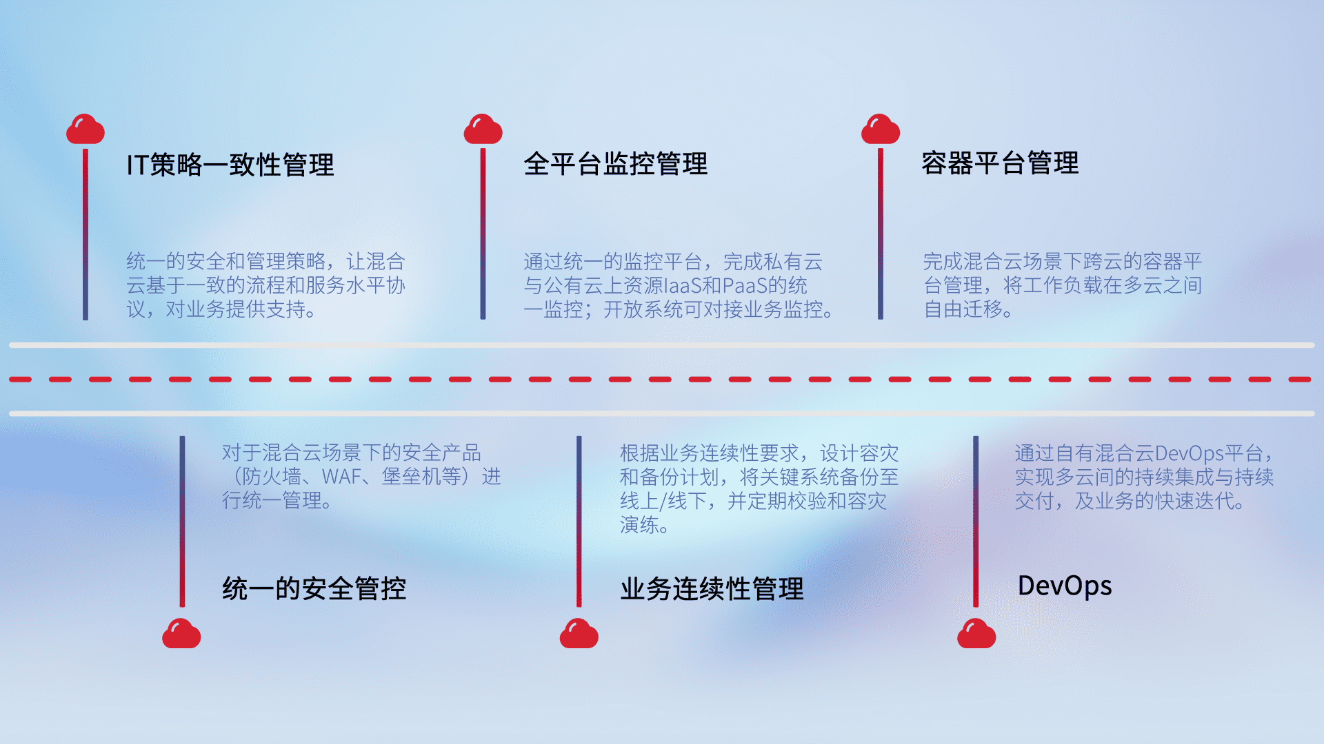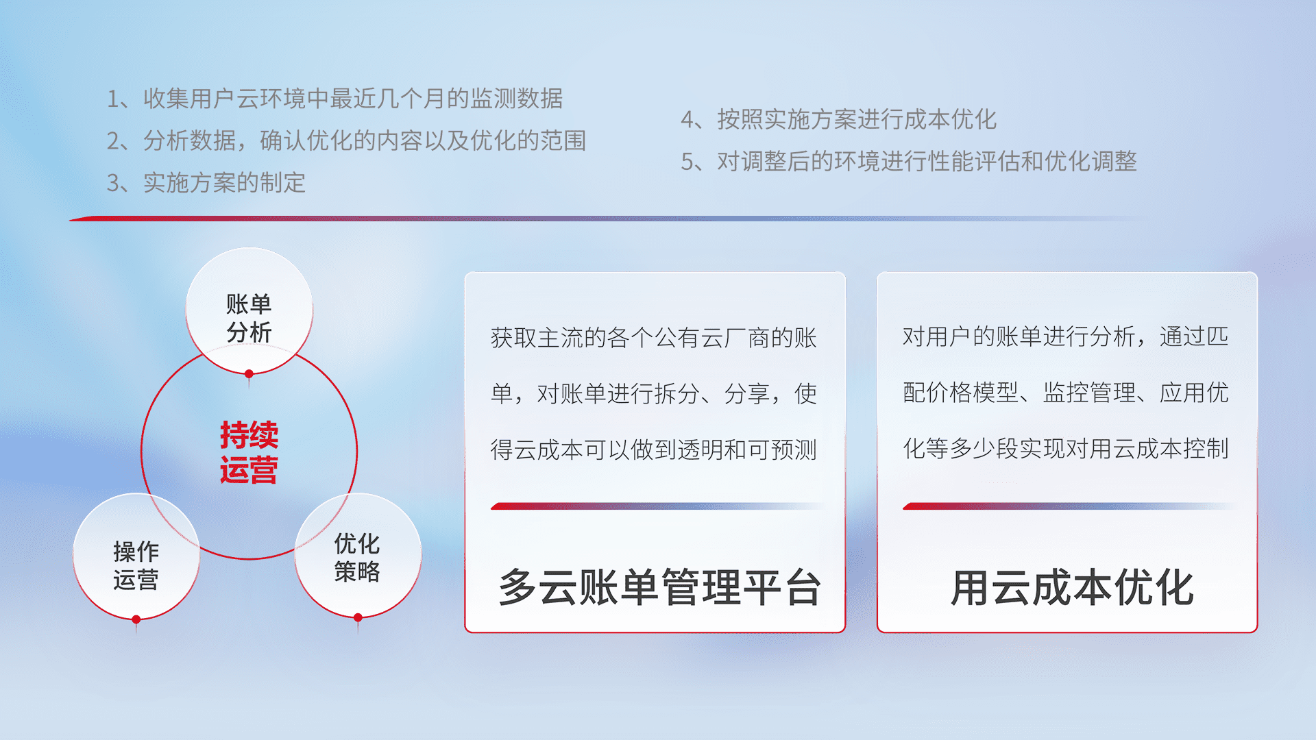 通过多云纳管,,,,以统一的资源数据模型把客户的云资源进行抽象和封装,,,进而实现对多云资源的统一操作,,保障云资源管理的可靠性、、、稳定性与可用性。。量身定制化运维内容,,配置、、、开发运维、、补丁管理、、、备份、、、、监控、、、、认证和访问管理、、审计和日常巡检等,,,,保障在用云过程中的可靠度,,稳定度以及高可用率。。