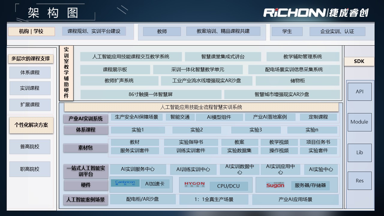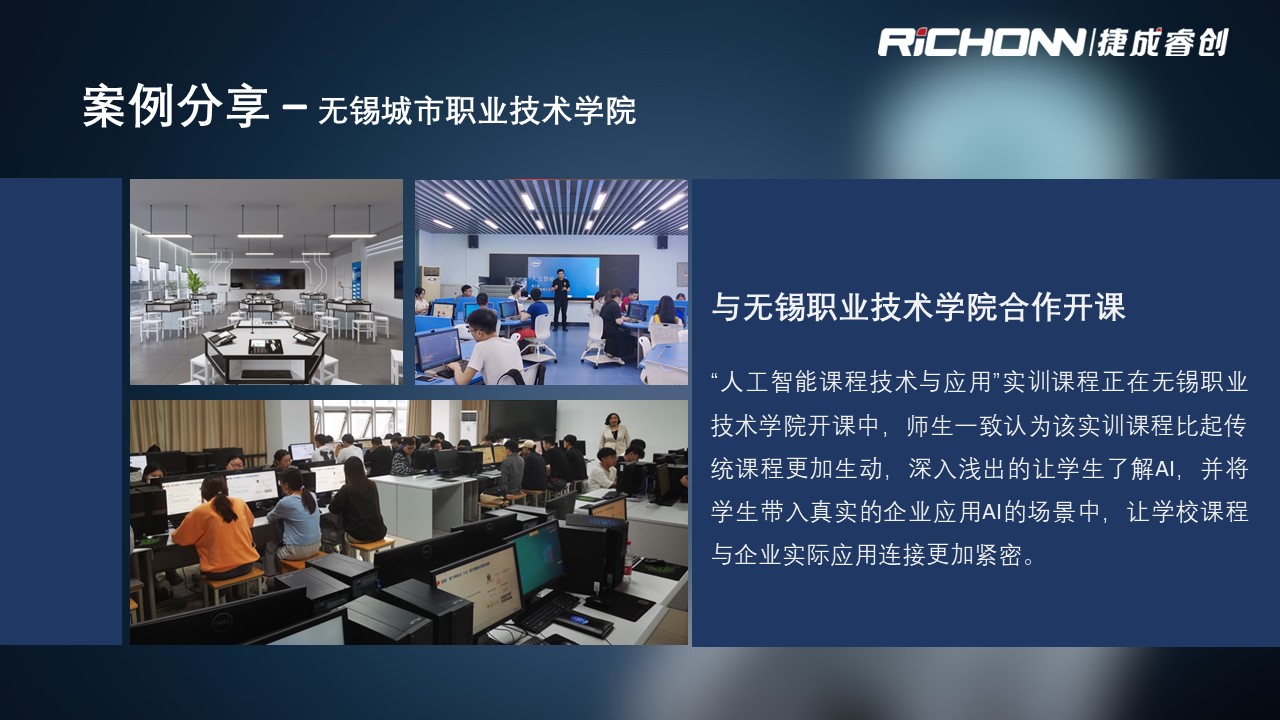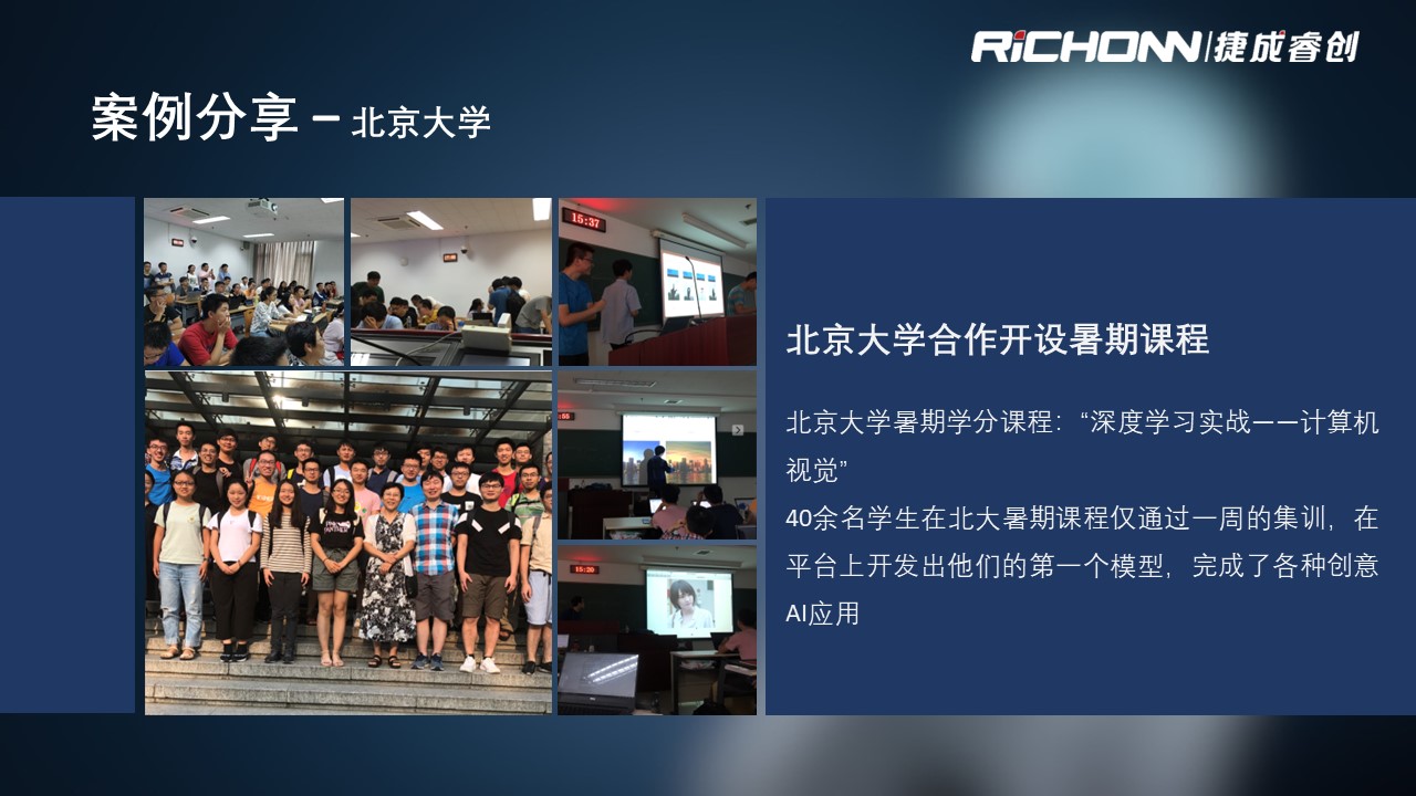 人工智能实训室通过“零门槛、、、、全流程、、、可扩展、、双元双真”的解决方案,,,,与学校进行课程共建,,,,支撑AI产业急需的应用型人才的培养。。。。